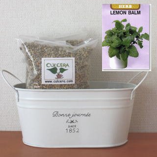 ベランダガーデニング用に開発されたセラミック製土【カルセラ】とプランター・種がすべてセットになった栽培セットです。ベランダや室内で栽培できます。初心者にも簡単なレモンバーム。種を蒔く時期は、3月-7月 9月-10月です