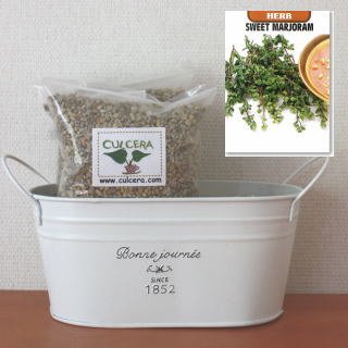 ベランダガーデニング用に開発されたセラミック製土【カルセラ】とプランター・種がすべてセットになった栽培セットです。ベランダや室内で栽培できます。初心者にも簡単なスイートマジョラム。種を蒔く時期は、3月-6月 9月-10月です