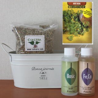ベランダガーデニング用に開発されたセラミック製土【カルセラ】とプランター・種・液体肥料がすべてセットになった栽培セットです。ベランダや室内で栽培できます。初心者にも簡単なコリアンダー。種を蒔く時期は、3月-6月 9月-10月です