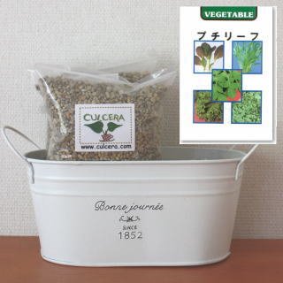 ベランダガーデニング用に開発されたセラミック製土【カルセラ】とプランター・種がすべてセットになった栽培セットです。ベランダや室内で栽培できます。初心者にも簡単なベビーリーフ(プチリーフミックス)。種を蒔く時期は、3月-10月です