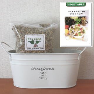 ベランダガーデニング用に開発されたセラミック製土【カルセラ】とプランター・種がすべてセットになった栽培セットです。ベランダや室内で栽培できます。初心者にも簡単なベビーリーフ(サラディーミックス)。種を蒔く時期は、3月-12月です