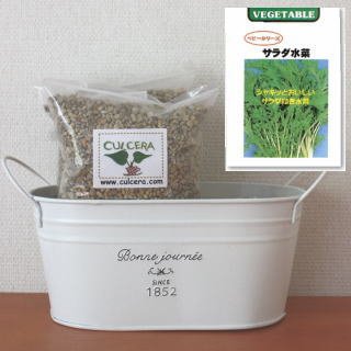 ベランダガーデニング用に開発されたセラミック製土【カルセラ】とプランター・種がすべてセットになった栽培セットです。ベランダや室内で栽培できます。初心者にも簡単なベビーリーフ(サラダ水菜)。種を蒔く時期は、3月-12月です