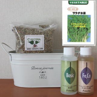 ベランダガーデニング用に開発されたセラミック製土【カルセラ】とプランター・種・液体肥料がすべてセットになった栽培セットです。ベランダや室内で栽培できます。初心者にも簡単なベビーリーフ(サラダ水菜)。種を蒔く時期は、3月-12月です