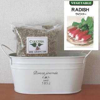 ベランダガーデニング用に開発されたセラミック製土【カルセラ】とプランター・種がすべてセットになった栽培セットです。ベランダや室内で栽培できます。初心者にも簡単なウィンナーラディッシュ。種を蒔く時期は、真夏・真冬を除き周年です
