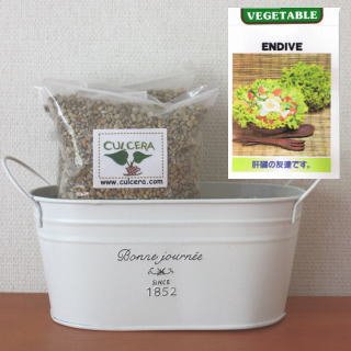 ベランダガーデニング用に開発されたセラミック製土【カルセラ】とプランター・種がすべてセットになった栽培セットです。ベランダや室内で栽培できます。初心者にも簡単なエンダイブ。種を蒔く時期は、厳冬と酷暑を除き周年です
