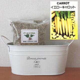 ベランダガーデニング用に開発されたセラミック製土【カルセラ】とプランター・種がすべてセットになった栽培セットです。ベランダや室内で栽培できます。初心者にも簡単なイエローキャロット。種を蒔く時期は、4月-5月 8月-10月です