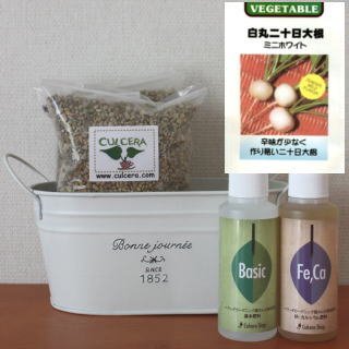 ベランダガーデニング用に開発されたセラミック製土【カルセラ】とプランター・種・液体肥料がすべてセットになった栽培セットです。ベランダや室内で栽培できます。初心者にも簡単な白丸二十日大根(ミニホワイト)。種を蒔く時期は、真冬を除き周年です