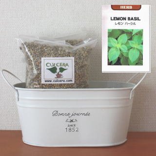 ベランダガーデニング用に開発されたセラミック製土【カルセラ】とプランター・種がすべてセットになった栽培セットです。ベランダや室内で栽培できます。初心者にも簡単なレモンバジル。種を蒔く時期は、4月-8月です