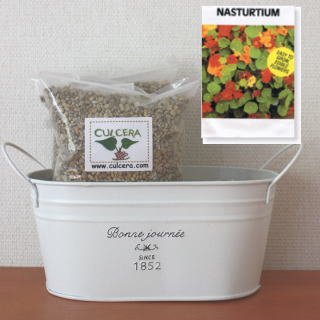 ベランダガーデニング用に開発されたセラミック製土【カルセラ】とプランター・種がすべてセットになった栽培セットです。ベランダや室内で栽培できます。初心者にも簡単なナスタチューム。種を蒔く時期は、4月-8月です