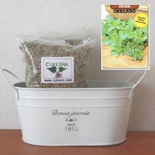 ベランダガーデニング用に開発されたセラミック製土【カルセラ】とプランター・種がすべてセットになった栽培セットです。ベランダや室内で栽培できます。初心者にも簡単なオレガノ。種を蒔く時期は、3月-6月 9月-10月です