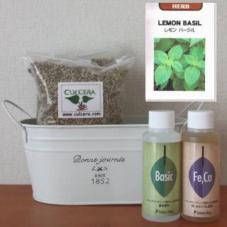 ベランダガーデニング用に開発されたセラミック製土【カルセラ】とプランター・種・液体肥料がすべてセットになった栽培セットです。ベランダや室内で栽培できます。初心者にも簡単なレモンバジル。種を蒔く時期は、4月-8月です