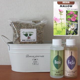 ベランダガーデニング用に開発されたセラミック製土【カルセラ】とプランター・種・液体肥料がすべてセットになった栽培セットです。ベランダや室内で栽培できます。初心者にも簡単なマロウ(うすべにあおい)。種を蒔く時期は、4月-6月 9月-10月です