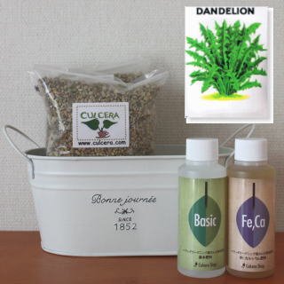 ベランダガーデニング用に開発されたセラミック製土【カルセラ】とプランター・種・液体肥料がすべてセットになった栽培セットです。ベランダや室内で栽培できます。初心者にも簡単なダンデライオン。種を蒔く時期は、3月-6月 9月-10月です