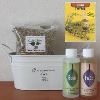 ベランダガーデニング用に開発されたセラミック製土【カルセラ】とプランター・種・液体肥料がすべてセットになった栽培セットです。ベランダや室内で栽培できます。初心者にも簡単なタイム。種を蒔く時期は、4月-6月 9月-10月です