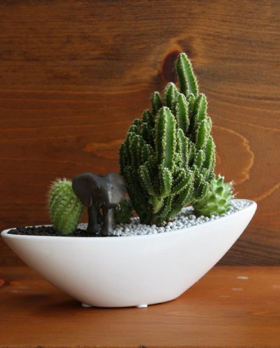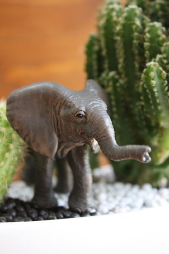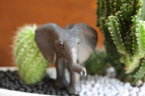 - セレウスペルビアナスと玉サボテンを植え込み、リアルなフィギアのゾウを配置しています