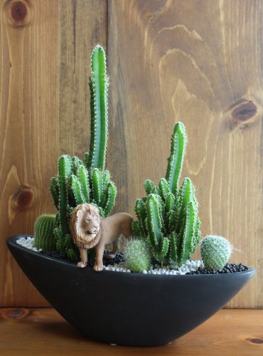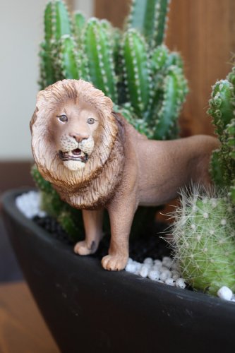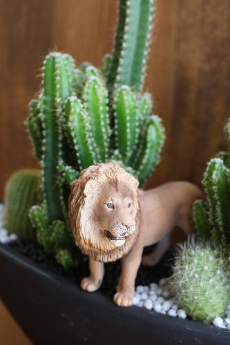 - セレウスペルビアナスと玉サボテンを植え込み、リアルなフィギアのライオンを配置しています