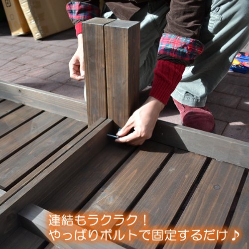 天板厚10mm台の製品が多い中、23mm厚で十分な強度を実現!脚の太さは70mm角を採用!太陽のもとでのくつろぎスペースだから……サンデッキと名づけました。天然木製ウッドデッキ、90×90cmのデッキ1台にステップ台付きのセット商品です。デッキ同士はボルトで連結し固定できます。ウッドデッキは正方形なのでお好みの方向に連結できます。組立はとてもカンタンです。天板はデッキ枠と一体型のため、足をボルトで取り付けるだけで完成します。継ぎ足して使えばどんなレイアウトも自由自在。36.5cmの高さは掃出し窓の外に置くのにうってつけ。カラーは人気のダークブラウン(ステイン系塗装)。お庭をシックに彩ります。システムサンデッキシリーズは互換性がありますのでタテヨコ自由に連結可能です。