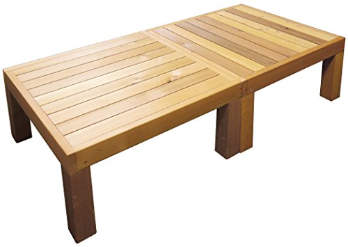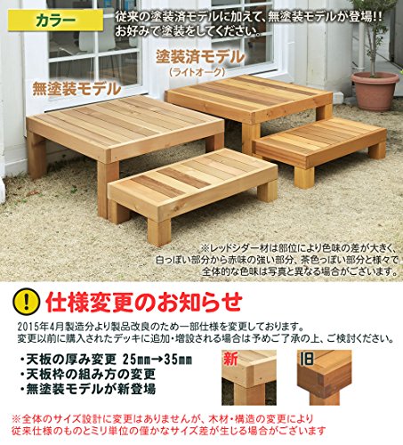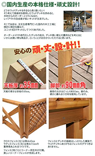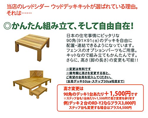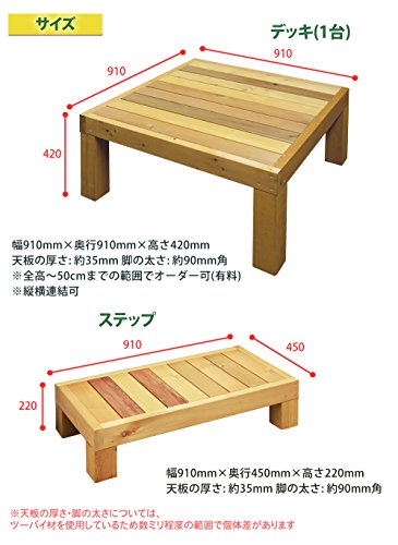 ユニット式で簡単・自由に設置でき、その上末永くお使いいただけるウッドデッキキットができました。耐久性(耐候性・防腐・防虫)に優れたカナダ産のウエスタンレッドシダーを国内の木工工場でていねいに仕上げた上質なウッドデッキです。木材保護塗料で塗装し、さらなる耐久性を追求しています。天板厚はなんと35mmもあり、支える脚も90mm角と重厚感たっぷりです。大自然の恵みが凝縮したレッドシダーの輸入材を熟練の木工職人さんが心をこめてひとつひとつ丁寧に製作いたします。本物の質感をお確かめください。こちらは91×91cmのデッキが2台の商品になります(ステップ台無し)。並べて縁台風に使えます。※同シリーズは互いに並べて延長可能で、オプション品としてクロスフェンス・ラティスフェンスがございます。在庫状況によっては受注生産となり、発送までに1週間〜10日程度要します(数量が多い場合や繁忙期はさらにお時間頂戴する場合もございます)。高さ(脚の長さの延長・短縮)の変更が可能です。高さ変更は有料で3000円(デッキ1台あたり1500円)になります。高さの変更は必ずご連絡いただき、専用の高さ変更オプション[ASIN: B008EQUEMQ]も一緒にご注文ください(寸法をお間違えのないようにお願いします)。