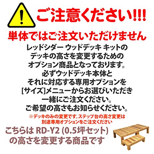 【この商品は単体でご注文いただけません】レッドシダー ウッドデッキキット 0.5坪セット(RD-Y2) [ASIN: B007PY8MKE] 1セット分のデッキの高さを変更する有料オプションです。全高50cmまでの範囲で延長・短縮の変更が可能です。RD-Y2(0.5坪セット) と一緒に同数をご注文いただき、ご希望の高さをご連絡ください。※ステップ台の高さ変更は別途ステップ台高さ変更オプション(RD-CUSTOM-S945)をご注文ください。※商品ページのサイズ選択欄から各商品へ移動できます。