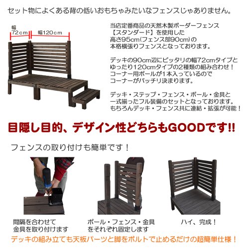 - 商品内容: 90×90cmウッドデッキ1台[0.25坪]、ステップ台、フェンス(72cm幅)×2、ポール(ストレート連結用)×2、ポール(コーナー用)×1、ポール固定用平地金具×3、ネジ類 ※組立式