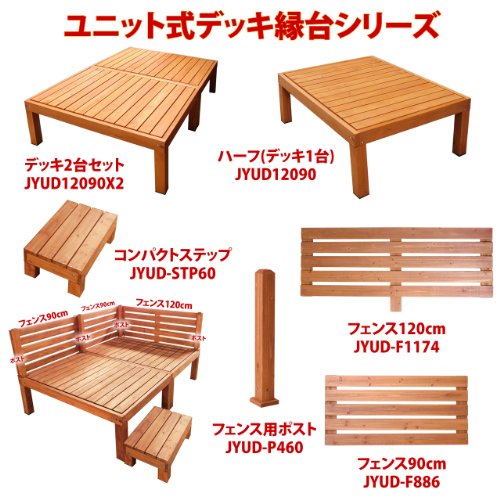 ユニット式デッキ縁台シリーズのステップ台のみの商品です(デッキ縁台等は含まれませんので[サイズ]メニューより移動して別途お求めください)。脚の太さ70mm角と余裕の頑丈設計(ステップ台の脚にはゴムは付属いたしません)。ユニット式デッキ縁台に関係なく、他のウッドデッキなどのステップ台としてご利用いただけます。ユニット式デッキ縁台シリーズは天板厚25mm厚の頑丈設計と120×90cmという日本の住宅事情にマッチした絶妙サイズが大好評のかんたん組み立て・拡張自由な縁台・ウッドデッキキットです。シリーズ各商品へは[サイズ]メニューより移動が可能です。