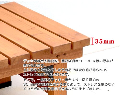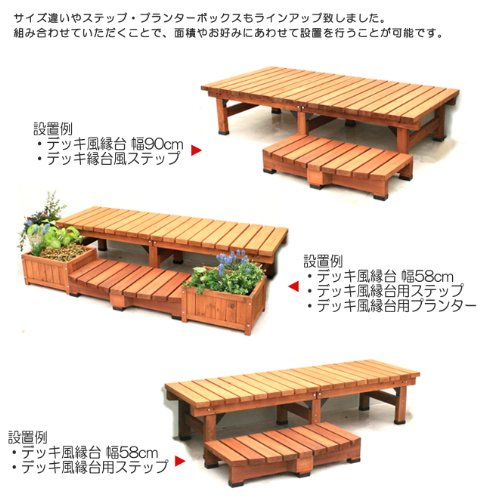 - 分厚い35mmの天板を採用したデッキ風縁台シリーズです。ウッドデッキのようなガッチリしたデッキがかんたんに設置できます。地面との接地面はゴム加工により、ガタツキや木口からの水の吸い上げによる腐食を防止します。脚部補強材にスチールを使うことで、安定感をより向上させました。サイズバリエーションも豊富でステップ台やプランターボックスもご用意。それらを組み合わせると様々なアレンジが可能です。他の商品は[サイズ]メニューよりご覧ください。
