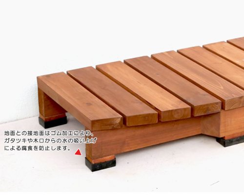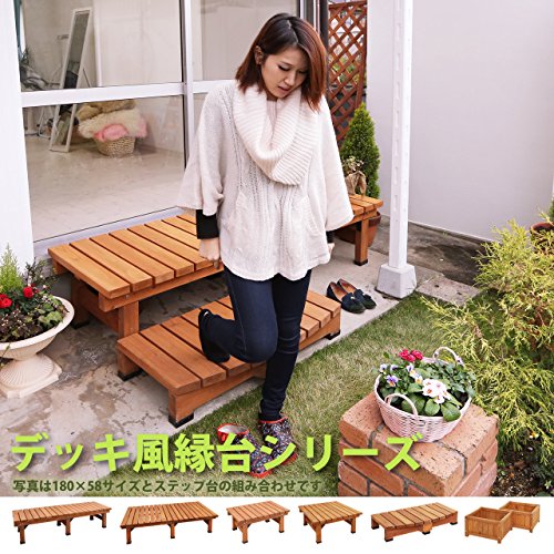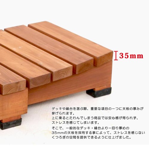 - 分厚い35mmの天板を採用したデッキ風縁台シリーズのステップ台です。単体でのご使用はもちろん、デッキ風縁台シリーズの他の商品と一緒に使用することで様々なアレンジが可能です。他の商品は[サイズ]メニューよりご覧ください。