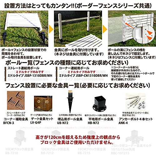 フェンスとポールに加えて、土の地面には埋め込み用金具(UB-N72)、板やコンクリート床には平地用金具(HB-N72)、コンクリート固定用にはアンカーボルト(ANK-4)、、ゲートを設けるにはゲート金具セット(LV-G4P)、コーナーを作るにはコーナー補助金具(BFCN-3)など、フェンスの設置計画に応じて適宜必要な商品をお求めください。