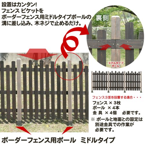 システムキットで簡単設置の本格ウッドフェンス!ボーダーフェンス 「ピケット ミドル」です。カントリーテイスト満点のピケットフェンスです!専用のフェンス・ポール・金具を用いて様々な環境で木製フェンスを設置していただけます。ポールはミドルタイプをお選びください(高さが120cmを超えるため強度上の観点からブロック金具を用いてのブロック塀への設置はできません)。フェンスとポールは[サイズ]メニューからジャンプできます。金具等は「ボーダーフェンス」もしくは品番等で検索してください。詳しくは商品画像もご覧ください。