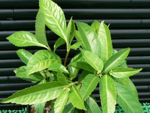 光沢のある濃緑色の葉の上にのるような形で穂状花序を出し、5~6mの果実が