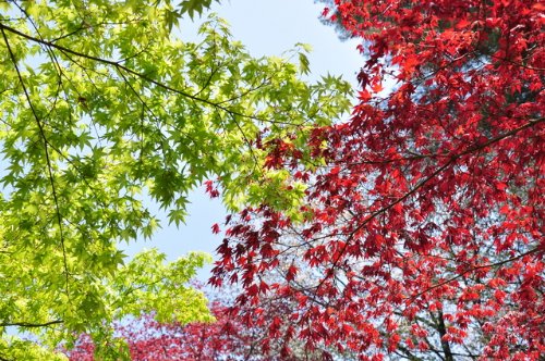 「ノムラモミジ」は新芽から赤色をしています。イロハモミジなどと違い、春でも紅葉しているように赤い葉の品種です。