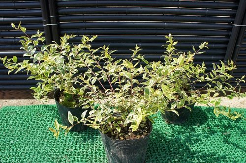 アベリアの斑入りの品種で、特徴は葉に斑が入り黄色っぽく、丸みを帯びた形をしています。