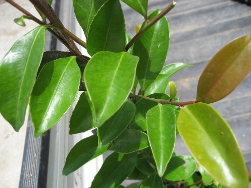 本榊 ツバキ科 サカキ属 常緑高木 サカキは、その名のとおり昔から神事に用いたり、神前に玉串として供えることに使用されてきました。 今でも神棚のご神前にあげる枝の木として使用されています。 葉は厚みがあり、深緑色で光沢があります。 初夏に小さな黄色い花をつけます。 【栽培】 あまり日当たりのよい場所では葉の色が紫がかった色になり、少し丸く反り返ったりしますので、少し日陰のほうがきれいな緑の葉になりますが、ある程度日が当たったほうが樹形はよくなります。 土質はあまり選びません。サカキは乾燥を嫌いますので、夏場の水管理は大切です! 乾燥すると葉の色が悪くなるほか、落葉したり下枝が枯れたりして樹形が悪くなります。 樹高は成木は4~5mになりますが、家庭の庭で栽培する場合は剪定で抑制するとよいです。