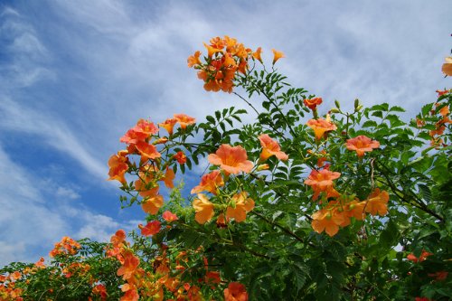 夏空に映える赤花orオレンジ色の花。