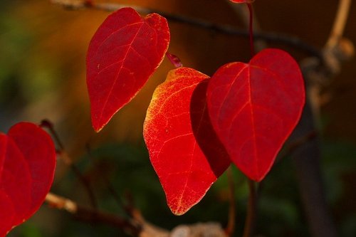 秋に咲くユニークな花。ハート形の葉の紅葉も美しい。