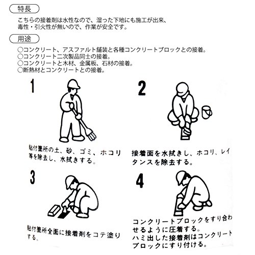 ◯コンクリート、アスファルト舗装と各種コンクリートブロックとの接着。◯コンクリート二次製品同士の接着。◯コンクリートと木材、金属板、石材の接着。◯断熱材とコンクリートとの接着。
