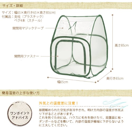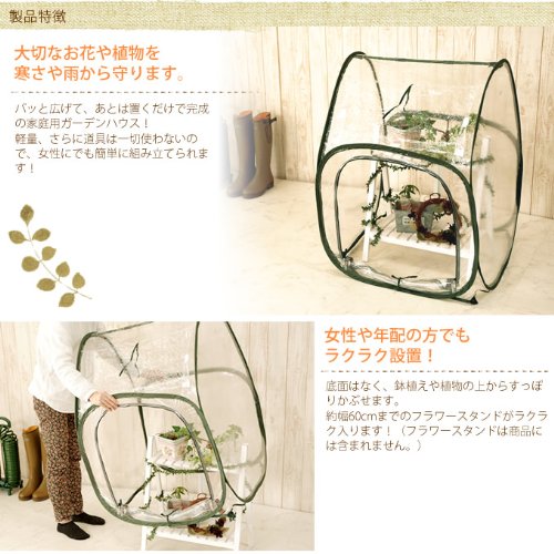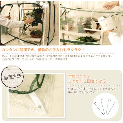 カバー上方には水遣り用に便利な巻き上げ式の窓付き。約幅60cmまでのフラワースタンドがラクラク入ります!