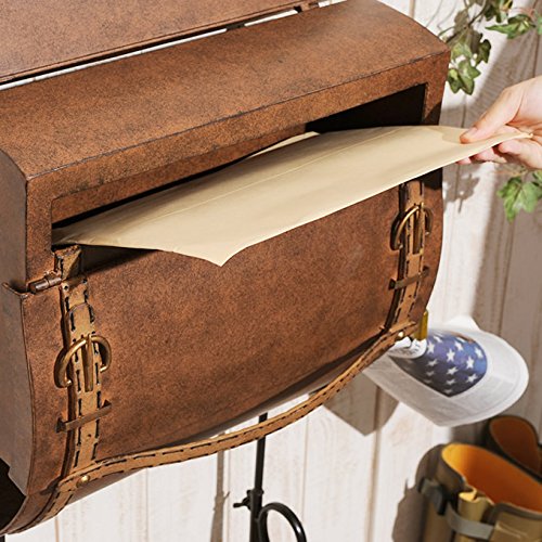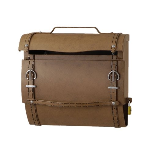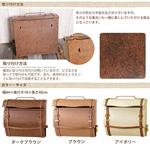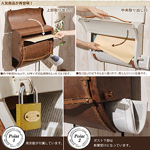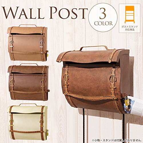 備考:レザーバッグを模したおしゃれなウォールポスト。アンティーク調の色合いで雰囲気たっぷり。内寸幅約35.5cmなので、A4サイズの収納物もしっかり入ります。取り出し口は下から上に開くので、雨も入りにくい仕様です。本体下部には新聞受けも付いています♪