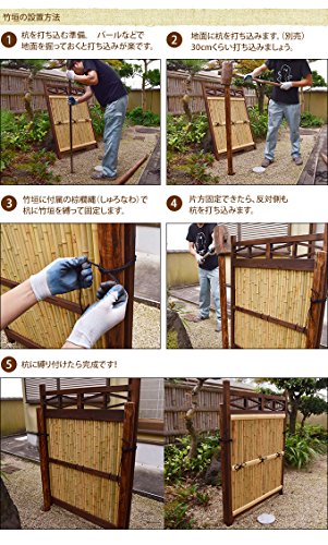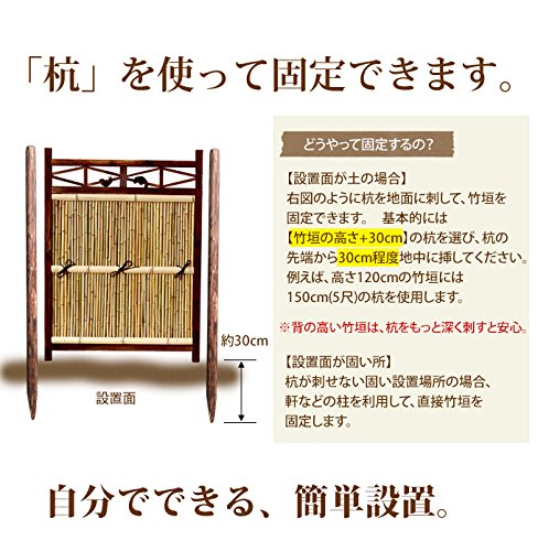 - 設置方法:横への繋ぎ方:竹垣専用金具を使用して頂くか、縄で繋いて下さい固定の仕方:下が地面の場合、しっかりとくいを埋めて下さい