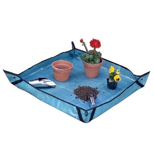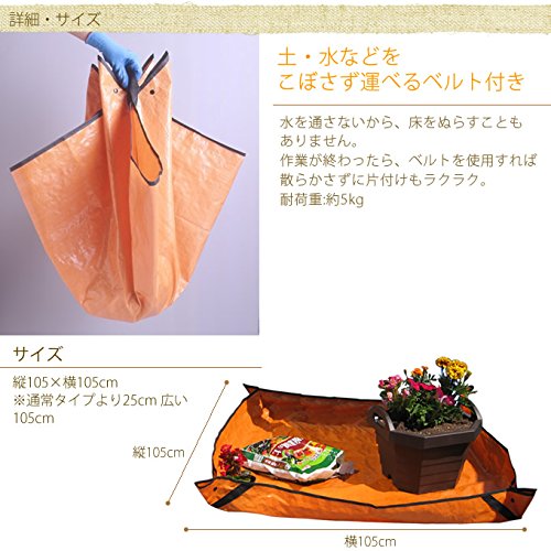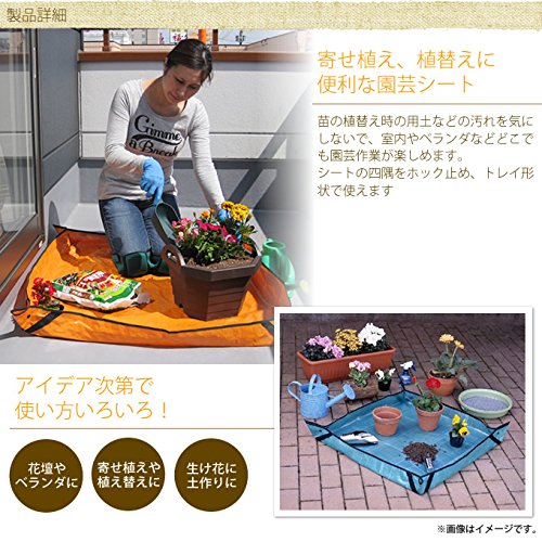 備考:四隅をホックで留めるとトレー状になるマルチシート。植え替え時の用土などの飛び散りを防ぎ、室内やベランダなどでも園芸作業が楽しめます。袋状にして持てるベルトも付いているので、土や水をこぼさずに運ぶこともできます。その他、レジャーシート、床のキズ防止、ペットのトイレの下敷きなど、マルチに使える便利な一枚です♪