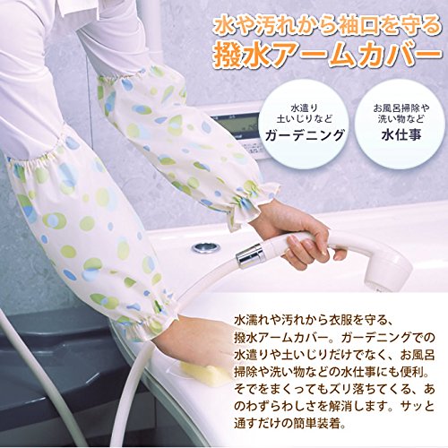 備考:水濡れや汚れから衣服を守る、撥水アームカバー。ガーデニングでの水遣りや土いじりだけでなく、お風呂掃除や洗い物などの水仕事にも便利。そでをまくってもズリ落ちてくる、あのわずらわしさを解消します。サッと通すだけの簡単装着。見た目も爽やかな水玉柄です♪