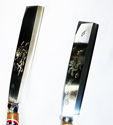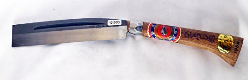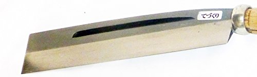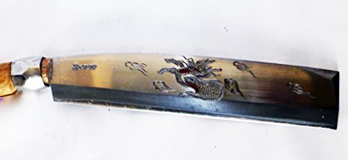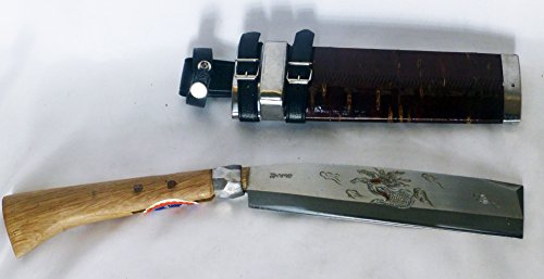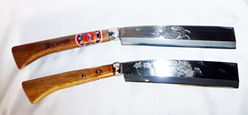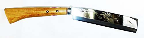 手打ちは柄の手元に向かうほど太くし、重心のバランスを取る。握り手の中心に重心を置くくことで、手首の疲労を軽くする。 機械打ちの使用鋼は等厚なので、重心はどうしても刀身の先にくる。枝打ちを何度も繰り返す作業は疲労が原因の怪我をなるべく少なくする必要がある。桜木のなたさやと6角どんがね。「てづくり」そのものが希少であり、そのうえ、彫金まで細工するなど、現代では貴重な一品です。事情を知るものにとっては越前武生の最盛期の作品と言わざるを得ない、、。