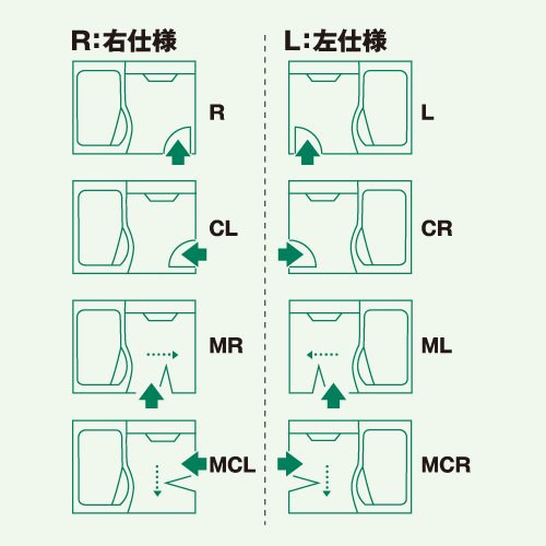 浴室のドア位置と浴槽位置によって右仕様(R)と左仕様(L)がありますので、ご確認ください。