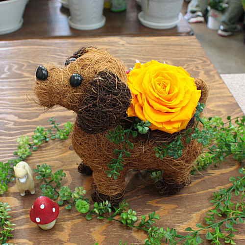 わんちゃんバスケット 大きなバラのプリザーブドフラワーアレンジメント 可愛いです (黄色)