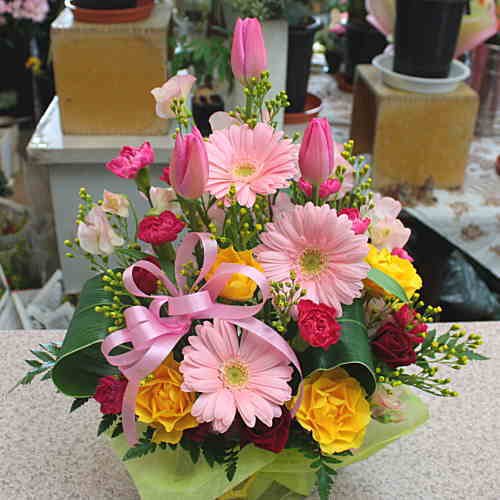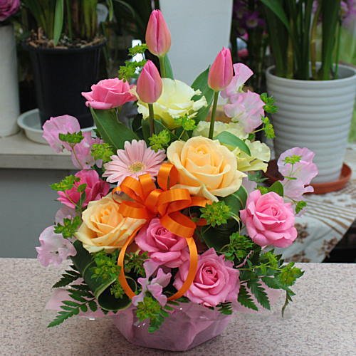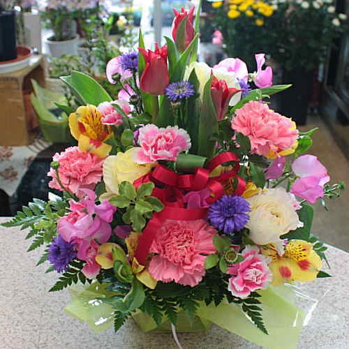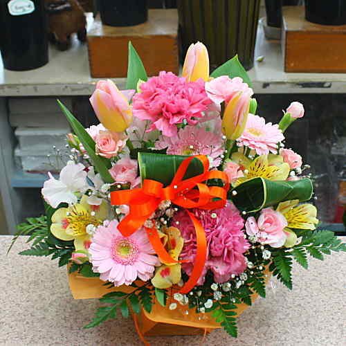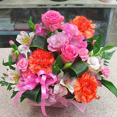 - 豪華なミックス系のカゴアレンジメントです。手軽にそのまま飾れて、とても華やかです。