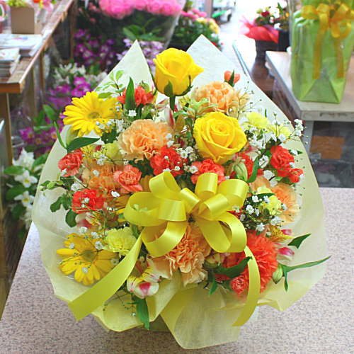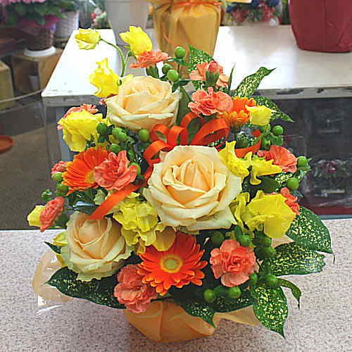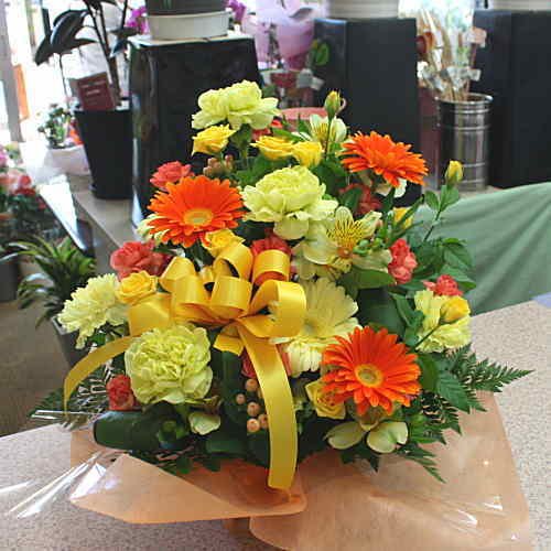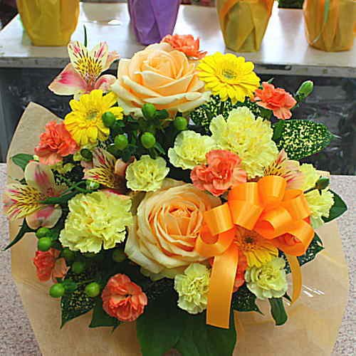 季節の花おまかせフラワーアレンジメントB(黄色オレンジ系)「誕生日」「お祝い」「お見舞い」「ギフト」