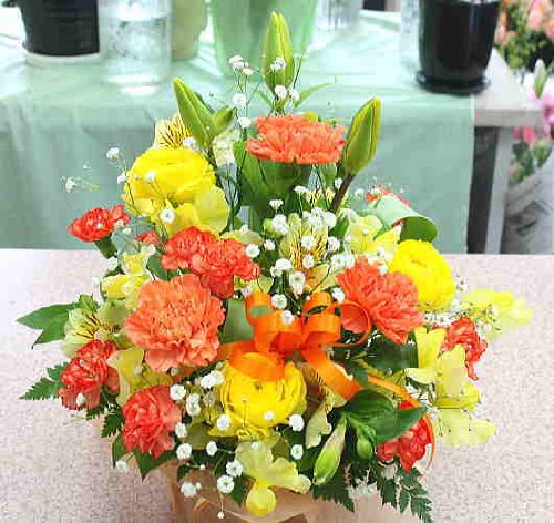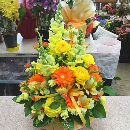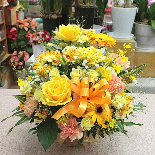 - 可愛い黄色オレンジ系のカゴアレンジメントです♪手軽にそのまま飾れて、とても華やかです。