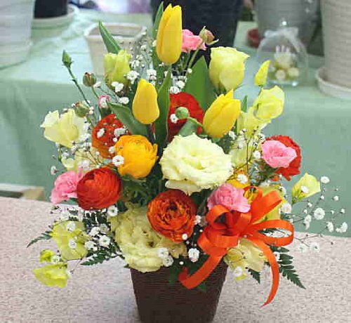 - サイズ:高さ約28センチ、横約25センチ、奥行き約20センチ、使用花材:花材はおまかせで季節や仕入れ状況によって変わります。