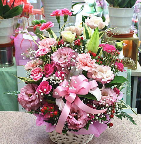 かすみ草とバラやカーネーション、ユリなどと季節の花をまとめて可愛くアレンジしています。