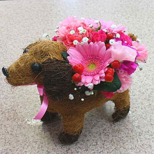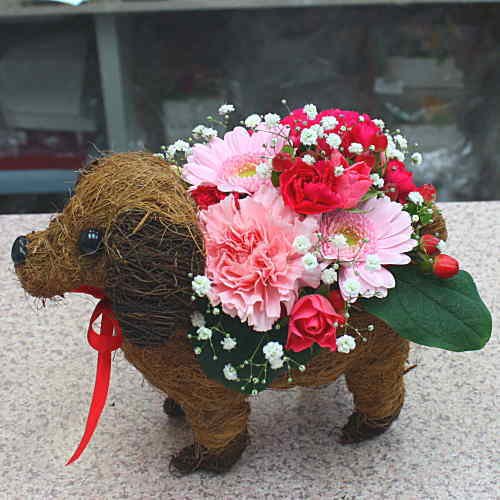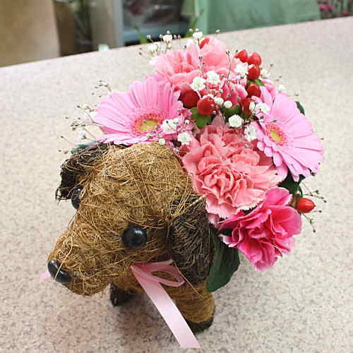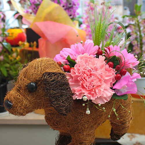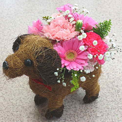 - 12時までのご注文は即日発送致します。可愛い犬のバスケットに季節のお花(生花)ピンク系でアレンジします。お送りした商品画像を見ることができます。「誕生日」「お祝い」「お見舞い」「ギフト」などプレゼント・贈り物にオススメです。